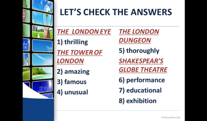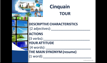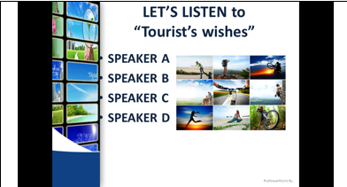 • Технология интерактивного обучения совместно с игровой технологией реализуются на втором и пятом этапах урока, в котором учащихся объединяются в группы с целью совместного решения задач: чтение с извлечением информации, представление рекламы тура. • Проблемно-поисковая технология реализуется на втором этапе урока в котором учащимся предлагают определить тип тура по услышанному эпизоду текста • Информационные технологии реализуются на протяжении всего урока при использовании видео материалов, презентаций учителя и учащихся, что делает урок интересным и наглядно иллюстрирует представленные темы урока. • Рефлексивное обучение/овладение ИЯ реализуется на четвертом и последнем этапах урока, на четвертом учитель анализирует ответы на основе компьютерного тестирования, на последнем учащиеся проводят самоанализ своей работы. Умение учиться непосредственно связано с «рефлексией» как умение самому учить себя.