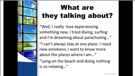 Задачи урока: - активизация лексики, обозначающей разные виды путешествий, закрепление ранее изученного лексического материала; -обучение аудированию с извлечением информации; - обучение чтению с извлечением информации в рамках формата ЕГЭ; - обучение устной речи в монологической форме с опорой на прочитанный текст, вербальную ситуацию и зрительную наглядность;