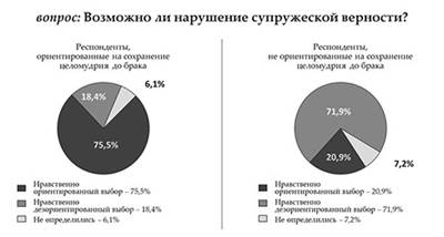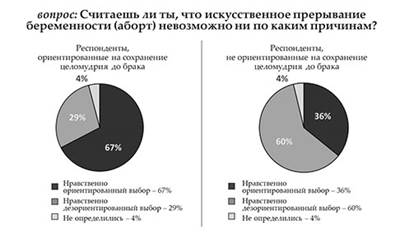 Оказалось, что человек, не ориентированный на сохранение девственной чистоты до брака, значительно (почти в 3 раза) менее нацелен на сохранение верности в браке. Супружеская верность — естественное основание крепкой семьи. Поэтому для стабилизации брачно-семейных отношений необходимо изменение общественного сознания и возвращение к признанию ценности целомудрия, включающей девственную добрачную чистоту. Существующая в средствах массовой информации пропаганда добрачных сексуальных связей, легкое отношение к сексуальным связям вне брака, «гражданский брак», недостаточное внимание к воспитанию семьянина в образовательных учреждениях являются причинами непрочности молодых семьей. Срывая покров сакральности, лишая детей естественной стыдливости и их права на незнание (которое характерно для русской самобытной культуры и культуры многих народов), взрослые ориентируют детей, подростков и молодежь на вседозволенность и безответственность во внебрачной и брачной жизни. С потерей целомудренного отношения к началу супружеской жизни изменилось отношение к рождению детей. В традиционной семье считалось, что рождение ребенка укрепляет семью, вносит новое в отношения супругов. Прерывание беременности считалось великим грехом и влекло за собой общественное осуждение и строгое церковное наказание (епитимию).