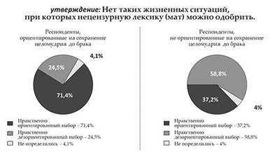 Далее, корреляционный анализ показал взаимосвязь между серией показателей ответов на вопрос «Считаешь ли ты необходимым сохранение целомудрия до брака?» и серией показателей ответов на вопрос «Считаешь ли ты, что искусственное прерывание беременности (аборт) невозможно ни по каким причинам» (диаграмма 2). Респонденты, не ориентированные на сохранение девственной чистоты до брака, дали вдвое больше дезориентированных ответов по сравнению с респондентами, ориентированными на сохранение целомудрия до брака. Таким образом, целомудренное отношение к сохранению девственности переносится на отношение к новой зародившейся жизни: кто нацелен на хранение девственности до брака, тот в значительно большей степени не приемлет искусственное прерывание беременности, аборт. Следующий аспект нравственной категории целомудрия изучался нами в связи с нецензурной, бранной лексикой, матом. Наука и религия убеждают в деструктивной силе воздействия сквернословия на человека, его душевное и телесное здоровье. От человека деструктивная сила идет на семью, затем переносится на общество. Общество, в котором не ругаются матом, а на нем разговаривают, трудно назвать духовно здоровым.