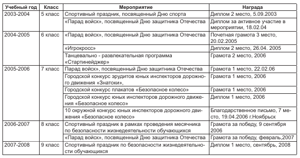 Ребята стараются проявить себя в написании творческих проектов, показывают замечательные результаты на олимпиаде по русскому языку - Н.Заварзина, английскому и французскому языках - Н.Суворина, на международном уровне - Г.Негру, получившая диплом в Праге. Есть призеры олимпиад по экологии на городском и окружном уровне - Н.Суворина, по физической культуре О.Рябицева. Каждый из моих воспитанников гордится победами своих одноклассников. Немало спортивных достижений среди ребят нашего класса. Главные призеры в соревнованиях по дзюдо - В.Лондар. Есть призеры городских конкурсов в бисероплетении - Н.Суворина. Многие знают солистку нашего класса группы «Серебряный олень» - М.Стогову.