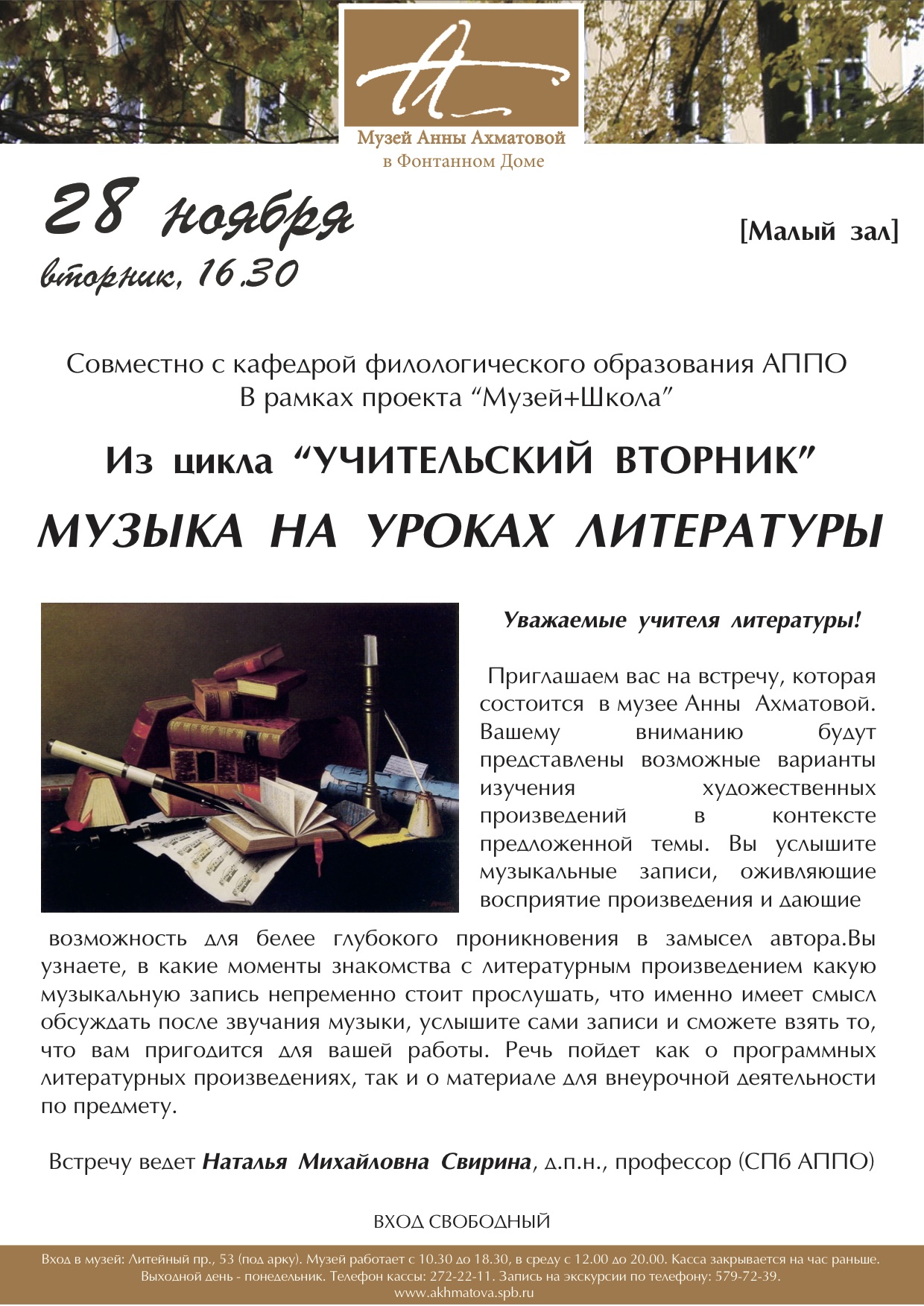 Музей Анны Ахматовой в Фонтанном Доме приглашает 28 ноября в 16.30 на очередную встречу проекта «Учительские вторники», призванного расширить границы профессионального, культурного и эстетического пространства педагогов и школьников.