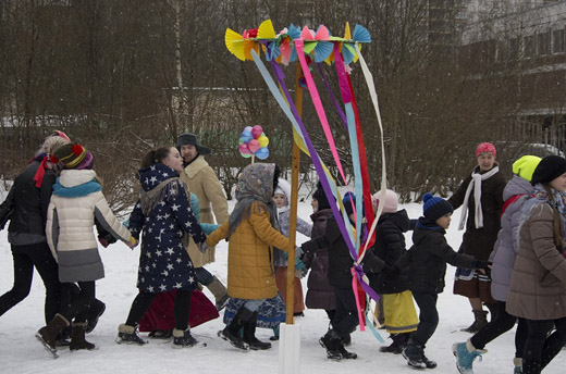 Участники праздника собрались на крыльце и с пением традиционных масленичных песен отправились во двор «Современника». Силами педагогов фольклорно-этнографического отдела он был украшен разноцветными флажками и традиционной ленточной каруселью, что сразу создавало праздничное настроение.