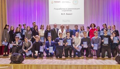 Александр Козырев подвел итоги первого года работы Школы Юных Стратегов Владимира Квинта. За это время учащиеся старших классов 622 гимназии посетили мастер-классы ведущих специалистов в области разработки и реализации стратегии, приняли участие в регулярных интерактивных практических занятиях, а также написали более 50 научно-исследовательских и проектных работ, представленных на всероссийских и городских конкурсах. Александр Козырев отметил высокую активность учеников и качество направляемых работ, многие из которых заняли первые места на конкурсах, позитивно оценивались экспертным сообществом и органами государственной власти. Ряд научных работ был отобран комитетом по науке и высшей школе Правительства Санкт-Петербурга и рекомендован для публикации. Авторы работ учащиеся 10А класса Мария Гурджиева, Дарья Ефимова и Ольга Михайлова, учащийся 10Б класса Владимир Алексахин, учащиеся 11А класса Арина Жигалева и Кирилл Толкачев получили авторские экземпляры сборника научных трудов.