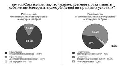 Видим, что в группе респондентов, ориентированных на сохранение целомудрия до брака, более чем в 2 раза выше процент тех, кто считает, что человек не имеет права лишить себя жизни ни при каких обстоятельствах. И наоборот, среди тех респондентов, которые не ставят никаких ограничений на вступление в интимные отношения, более чем в 3 раза выше процент тех, кто приемлет суицид. Заметим, что среди респондентов, ориентированных на сохранение целомудрия до брака, не определившихся относительно возможности суицида нет. Проведенное исследование дает возможность сделать вывод о том, что девичья честь и юношеская целомудренная чистота — основа крепости не только семейных устоев, но и ресурс нравственного благополучия нации и государства в целом. Целомудрие — это основа целомудренного (нравственного) образа жизни. Целомудренный образ жизни заложен в евангельских заповедях, в частности, в заповеди «Не прелюбодействуй». Вернемся к обозначенным в докладе протоиерея Сергия Филимонова аспектам демографического кризиса в России. На какие аспекты вероятностно влияет воспитание целомудренного образа жизни? Естественно, возникает вопрос, как формировать целомудренное отношение к добрачной.чистоте, целомудренный образ жизни в современных условиях, когда СМИ пропагандируют противоположное и нравственная категория целомудрия высмеивается как пережиток прошлого.